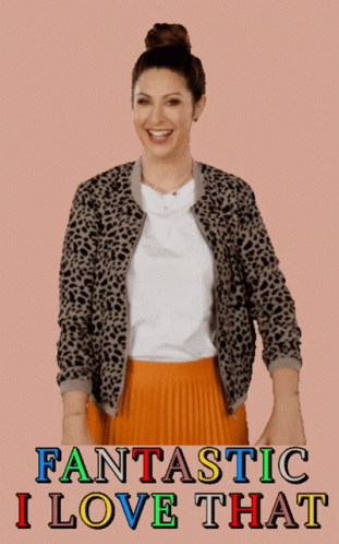 የይዘት መግለጫ: a woman wearing a leopard print jacket and an orange pleated skirt
