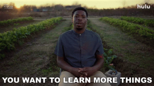 - Opis sadržaja: a man sitting in front of a field with the words you want to learn more things