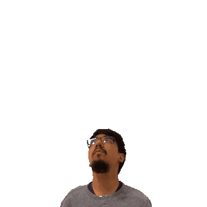 Inhaltsbeschreibung: a man with a beard and glasses looks up at the number 14