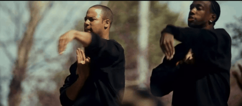 Inhaltsbeschreibung: two men in black shirts are dancing together in a park