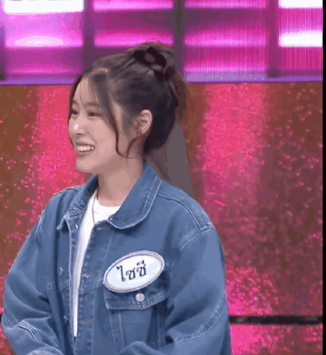 Content description: a woman wearing a blue denim jacket has a name tag on her chest that says ' ioi '