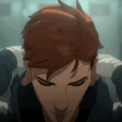 Content description: a close up of a person 's face with a bandage on their head .