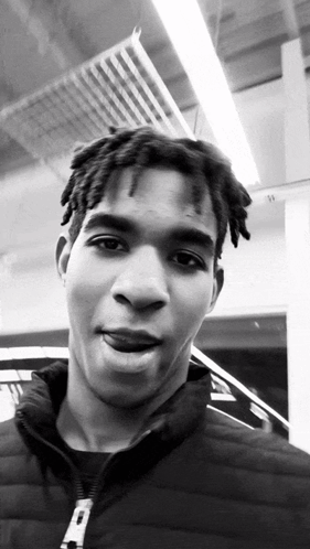 Content description: a black and white photo of a man wearing a black jacket with the letter p on it