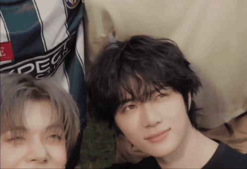beomgyu smiling resting his hand and face on yeonjun's shoulder
