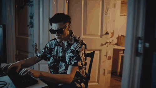 Content description: a man wearing sunglasses and a hawaiian shirt is typing on a laptop