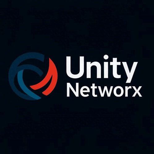 Descripción del contenido: a logo for unity network shows a blue and red swirl