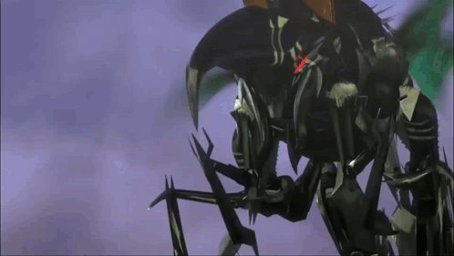 Deskripsi Konten: a robot with a purple background has a red light on its head