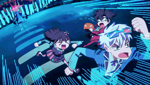 Lýsing á efni: a group of cartoon characters are running across a crosswalk