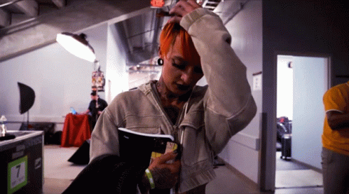 Lýsing á efni: a woman with red hair is reading a book in a room with a red exit sign above her head