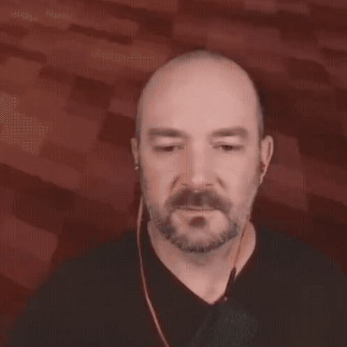 Lýsing á efni: a bald man with a beard wearing earbuds and a ring on his finger