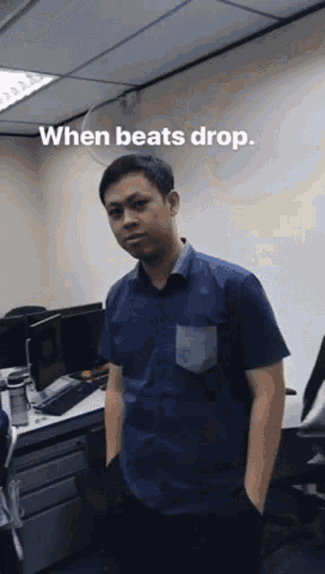コンテンツの説明: a man in a blue shirt stands in a room with the words when beats drop on the wall