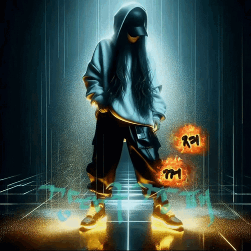 ការពណ៌នាអំពីខ្លឹមសារ: a woman in a hoodie stands in a dark room with chinese writing on the wall