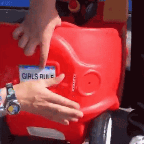 ការពណ៌នាអំពីខ្លឹមសារ: a red toy car has a tag that says girls rule on it