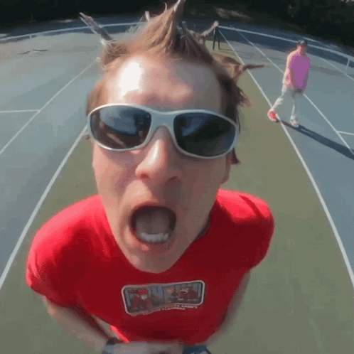 ការពណ៌នាអំពីខ្លឹមសារ: a man wearing sunglasses and a red t-shirt with a sticker on it that says ' a '