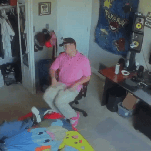 ការពណ៌នាអំពីខ្លឹមសារ: a man in a pink shirt dancing in front of a pokemon tapestry