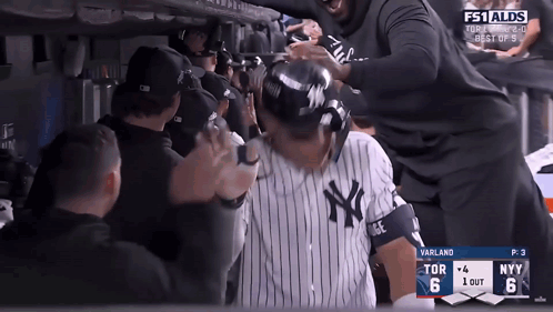 ការពណ៌នាអំពីខ្លឹមសារ: a new york yankees baseball player is being congratulated by his teammates in the dugout