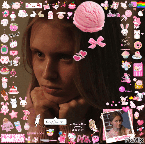 ការពណ៌នាអំពីខ្លឹមសារ: a girl with a pink ice cream scoop in her hair is surrounded by pink stickers