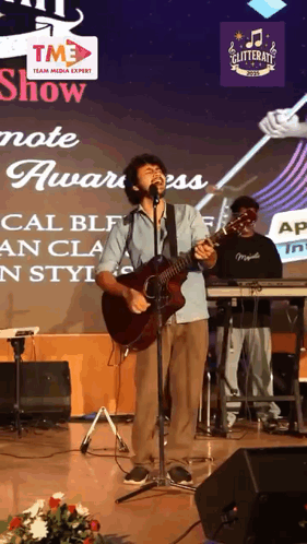 ការពណ៌នាអំពីខ្លឹមសារ: a man singing into a microphone while playing a guitar at a glitterati show