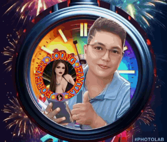ការពណ៌នាអំពីខ្លឹមសារ: a picture of a man giving a thumbs up in front of a clock that says forever family