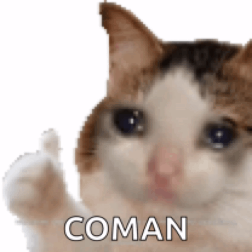 ការពណ៌នាអំពីខ្លឹមសារ: a crying cat is giving a thumbs up and the word coman is on the bottom of the image .
