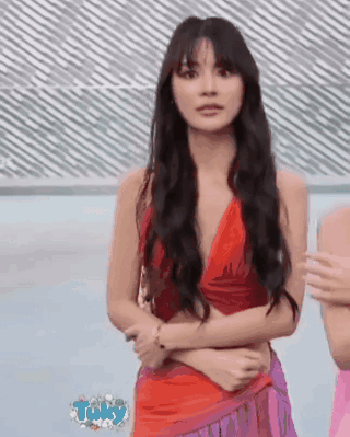 ការពណ៌នាអំពីខ្លឹមសារ: a woman in a red top and purple skirt is standing in front of a sign that says tuky