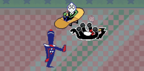 ការពណ៌នាអំពីខ្លឹមសារ: a pixel art of a man on a snowboard and a penguin