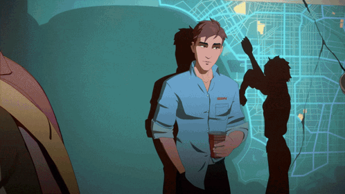 ការពណ៌នាអំពីខ្លឹមសារ: a man in a blue shirt stands in front of a map with a shadow