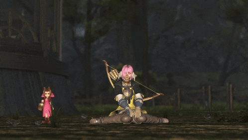 ការពណ៌នាអំពីខ្លឹមសារ: a video game character with pink hair is kneeling down with a bow and arrow