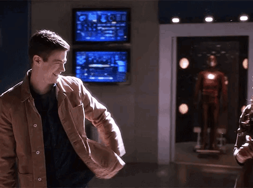 ការពណ៌នាអំពីខ្លឹមសារ: a man in a brown jacket is standing next to a woman in a room with a man in a suit in the background .