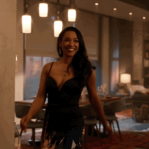 ការពណ៌នាអំពីខ្លឹមសារ: a woman in a black dress smiles in a room
