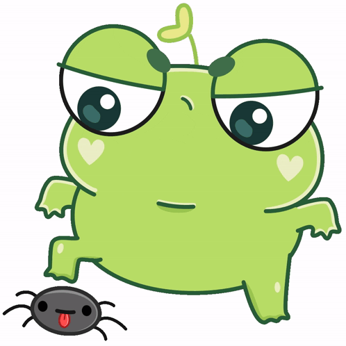 ការពណ៌នាអំពីខ្លឹមសារ: a green frog standing next to a black spider with its tongue sticking out