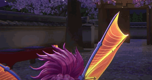 ការពណ៌នាអំពីខ្លឹមសារ: a cartoon character with purple hair and glowing wings is flying in the air .