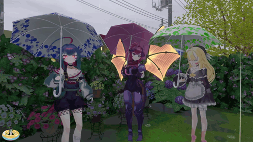 ការពណ៌នាអំពីខ្លឹមសារ: three anime characters holding umbrellas in a garden