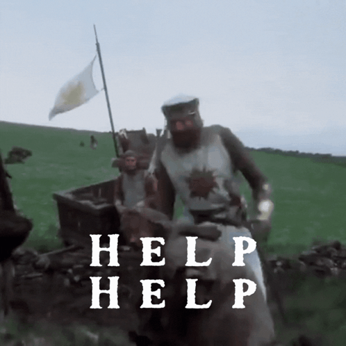 ការពណ៌នាអំពីខ្លឹមសារ: a man in a knight 's armor stands in a field with the words help help written on the bottom