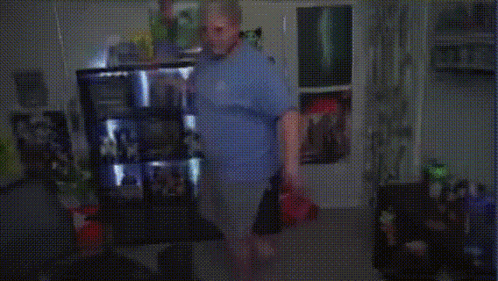 ការពណ៌នាអំពីខ្លឹមសារ: a man in a blue shirt is dancing in a room with posters on the wall
