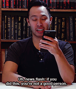 ការពណ៌នាអំពីខ្លឹមសារ: a man is looking at his phone and says " uh news flash if you did this you 're not a good person .. "