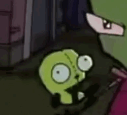 ការពណ៌នាអំពីខ្លឹមសារ: a cartoon character with a green head is standing next to another cartoon character in a dark room .