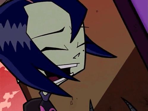 ការពណ៌នាអំពីខ្លឹមសារ: a cartoon character with purple hair is smiling and looking down