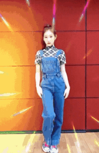ការពណ៌នាអំពីខ្លឹមសារ: a girl wearing overalls and a plaid shirt is standing in front of an orange wall .