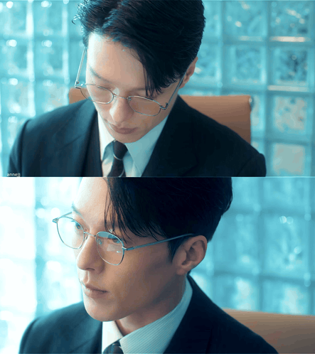 ការពណ៌នាអំពីខ្លឹមសារ: a man in a suit and tie wearing glasses is looking down