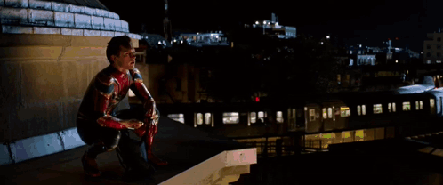 ការពណ៌នាអំពីខ្លឹមសារ: a man in a spiderman costume is sitting on a ledge in a dark room .