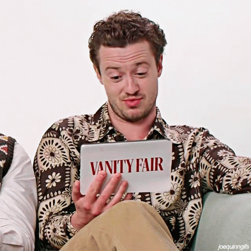 ការពណ៌នាអំពីខ្លឹមសារ: a man sitting on a couch looking at a vanity fair card