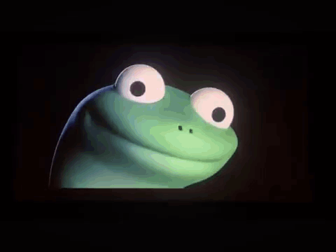 ការពណ៌នាអំពីខ្លឹមសារ: a green frog with big white eyes is looking at the camera in a dark room .