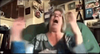 ការពណ៌នាអំពីខ្លឹមសារ: a woman is sitting on a couch with her mouth open and her hands up .