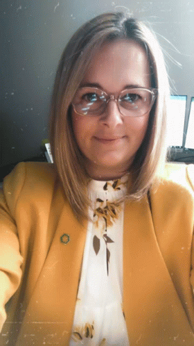 ការពណ៌នាអំពីខ្លឹមសារ: a woman wearing glasses and a yellow jacket is smiling for the camera