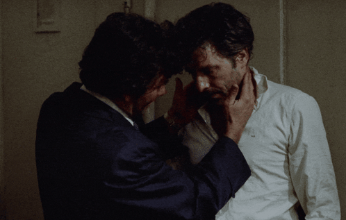 ការពណ៌នាអំពីខ្លឹមសារ: a man in a suit and tie touches another man 's neck