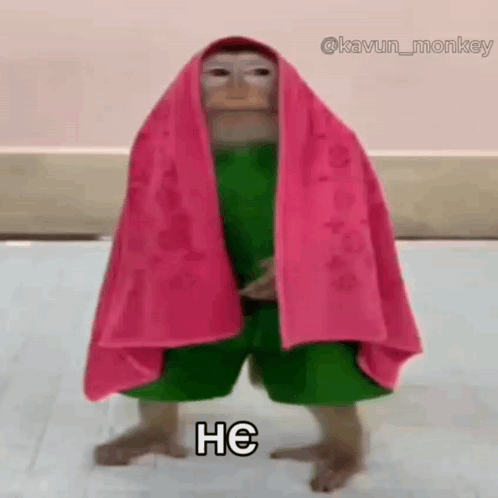 ការពណ៌នាអំពីខ្លឹមសារ: a monkey wearing a pink towel and green shorts is standing on a tiled floor .