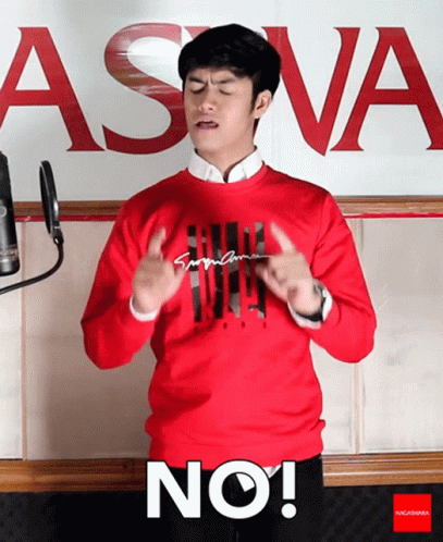 ការពណ៌នាអំពីខ្លឹមសារ: a man wearing a red sweater says no in front of a sign that says asva