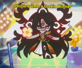 ការពណ៌នាអំពីខ្លឹមសារ: a cartoon character is standing on a stage with the words obscure umbra cookie winner written on the bottom .