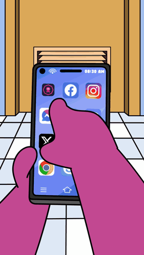 ការពណ៌នាអំពីខ្លឹមសារ: a cartoon drawing of a person holding a cell phone with the time of 8:30 am